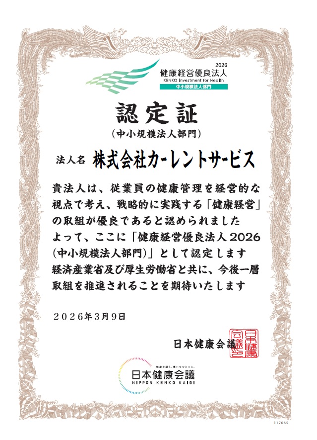 株式会社カーレントサービスは、経済産業省が創設した、特に優良な健康経営を実践している企業への顕彰制度「健康経営優良法人2026」に認定されました。