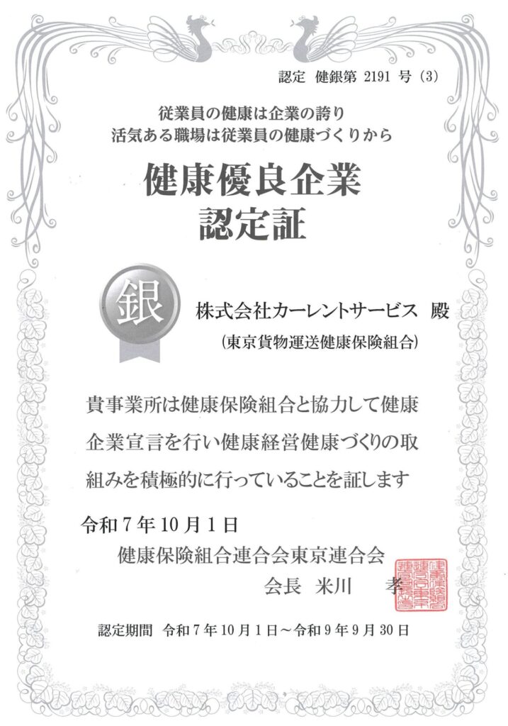 株式会社カーレントサービスは、健康経営健康づくりの取り組みを積極的に行っている企業として、健康優良企業「銀の認定」として認められました。
